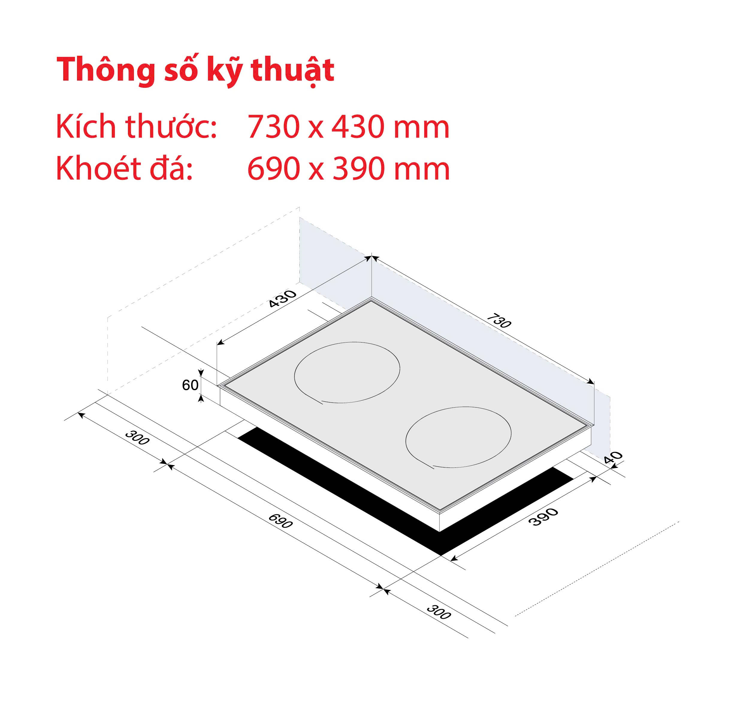 - Kích thước khoét đá: 690 x 390mm