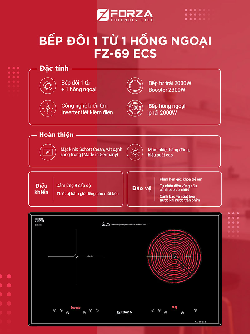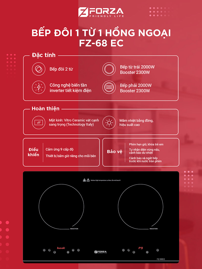 Một trong mẫu bếp từ của FORZA được rất nhiều khách hàng lựa chọn đó chính là Bếp đôi 2 từ FZ-68 ECS. Sở hữu mặt kính Schoot Ceran cao cấp cùng với khả năng kháng sốc nhiệt lên đến 800°C, chống trầy xước, chống sùi vô cùng tốt, sản phẩm trở thành sự lựa chọn của rất nhiều gia đình Việt.