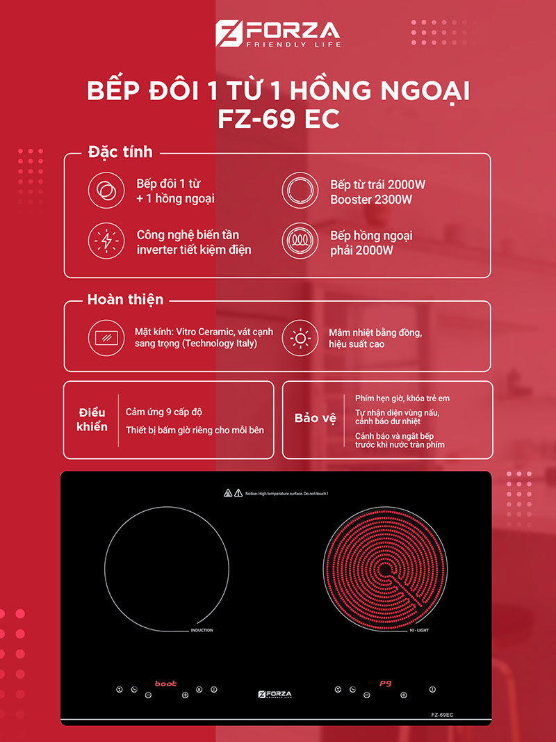 Sử dụng hoàn toàn mặt kính Vitro Ceramic vát cạnh, sang trọng giúp nâng tầm căn bếp của bạn rất hiệu quả. Có khả năng chịu nhiệt lên tới 700°C và chịu sốc tốt cũng như kết hợp giữa bếp hồng ngoại với bếp từ, sản phẩm Bếp Đôi 1 Từ 1 Hồng Ngoại FZ-69 EC cũng là một trong những mẫu bếp từ rất được ưa chuộng tại FORZA: