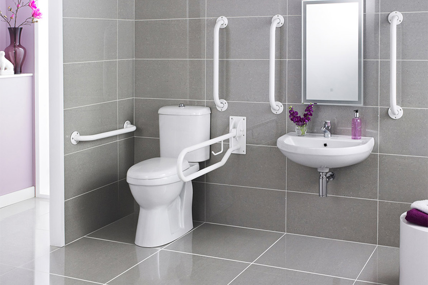 Thanh tay vịn được sử dụng với chất liệu thép, nhôm không gỉ, chịu được trọng lực cao, vừa nắm tay và được gắn chặt vào tường. Chúng thường được thiết kế cạnh bồn cầu, bồn rửa mặt. Nếu phòng tắm rộng có thể lắp đặt thêm cả lối đi vào hai vị trí này.